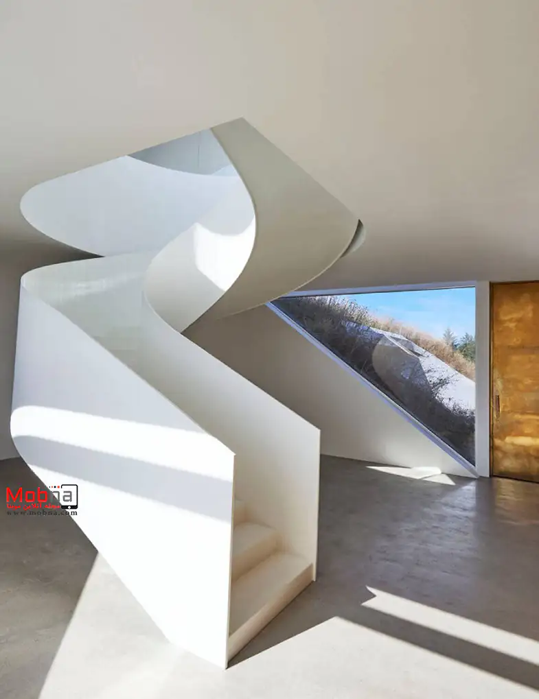 این خانه مارپیچی تعادل کاملی میان زندگی خصوصی و عمومی با محیط پیرامون ایجاد می کند. این در حالی است که صعود مداوم به سوی سطح نیز به آرامی انجام شده و فضای خانه و پارکینگ را جدا می کند.