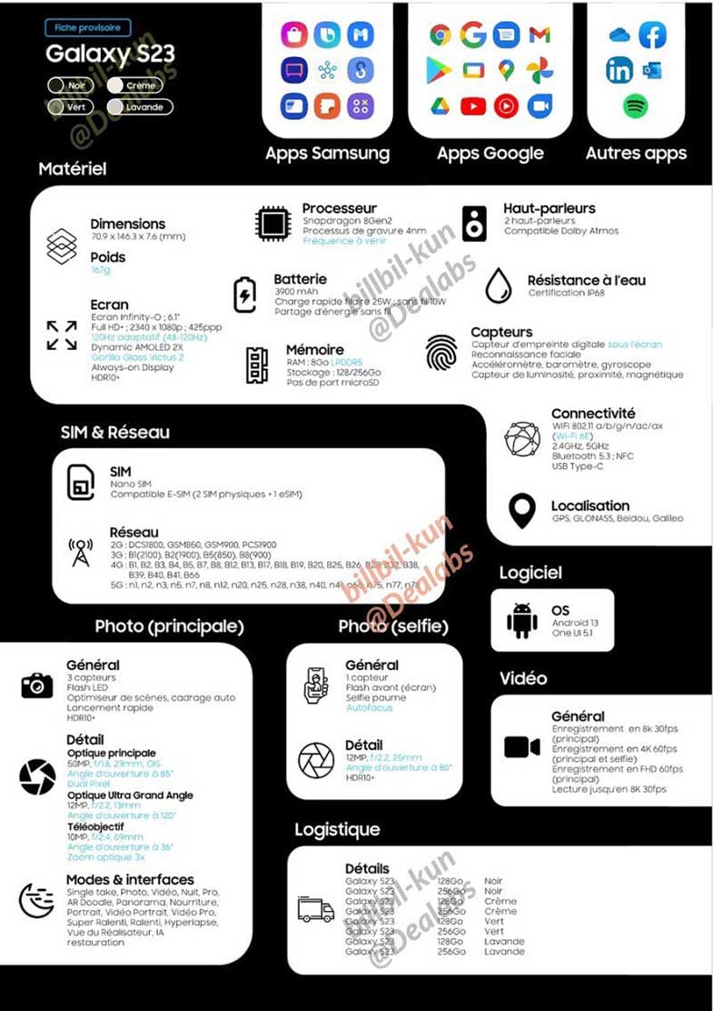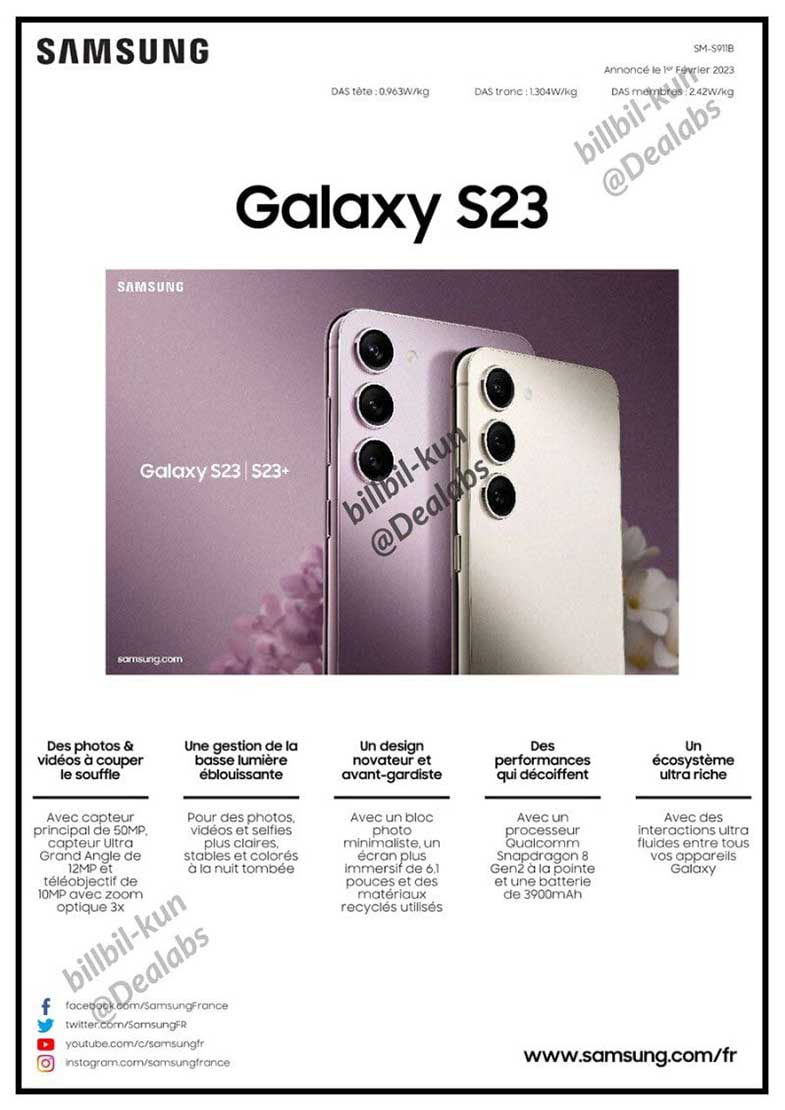 طبق اطلاعات این تصاویر، گلکسی S23 و S23 پلاس هم مثل برادر بزرگ خود از چیپست پرچمدار کوالکام استفاده میکنند و دوربین اصلی 50 مگاپیکسلی، فوق عریض 12 مگاپیکسلی و تلهفوتو با قابلیت زوم اپتیکال 3 برابری خواهند داشت. مدل معمولی انرژی خود را از یک باتری 3900 میلیآمپرساعتی و مدل پلاس انرژی خود را از یک باتری 4700 میلیآمپرساعتی میگیرد.