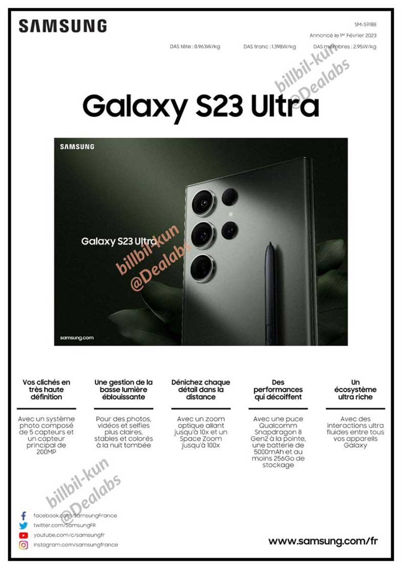 موبنا – ساعاتی پیش شاهد افشای مشخصات کامل گلکسی S23 و S23 پلاس بودیم. حالا نوبت به قدرتمندترین عضو این خانواده، یعنی گلکسی S23 اولترا رسیده است تا مشخصات آن منتشر شود. این گزارش جدید البته حاوی تصاویری است که ظاهراً برگه مشخصات رسمی هر سه پرچمدار سامسونگ در فرانسه را نشان میدهد.