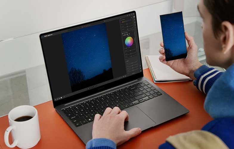 علاوه بر آن کاربران میتوانند بهطور یکپارچه بین چندین صفحه در دستگاههای مختلف بدون هیچ اختلالی جابهجا شوند. قابلیت Samsung Multi Control به شما امکان میدهد کامپیوتر شخصی، تبلت گلکسی Tab و اکنون گوشی هوشمند گلکسی خود را با کیبورد و پد لمسی یا اصطلاحا Trackpad، در گلکسی Book3 خود کنترل کنید. اکنون میتوانید دادههای دلخواه خود را بین دستگاههای گلکسی جابهجا کنید یا از گلکسی تب خود به عنوان نمایشگر دوم استفاده کنید و فضای در دسترس خود را بهطور موثری افزایش دهید. بدین ترتیب فرایند تولید محتوا بهطور فزایندهای در چندین دستگاه اتفاق میافتد و با سری گلکسی Book3 تولید اثر خلاقانه برای شما آسانتر میشود. برای مثال کاربران میتوانند با استفاده از قابلیت Expert RAW در گوشی هوشمند گلکسی خود عکسهایی با کیفیت فوقالعاده تهیه کنند و در لحظه آنها را به کمک برنامه Adobe Lightroom لپتاپ گلکسی Book3 خود ویرایش کنند.