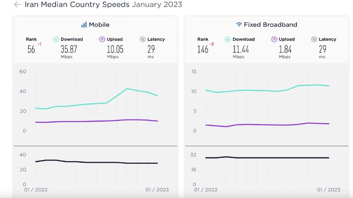 اکنون بر اساس شاخص «میانه» جایگاه اینترنت سیار کشور با یک رتبه افت به ۵۶ و اینترنت ثابت با ۲ پله افت به ۱۴۶ رسیده است. بهمن سال گذشته جایگاه ایران در اینترنت ثابت ۱۴۰ و در اینترنت همراه ۷۷ بود. این آمار نشان میدهد اینترنت سیار توانسته در ۱۲ ماه گذشته ۲۱ پله صعود کند و اینترنت ثابت با ۶ پله افت مواجه شده است.