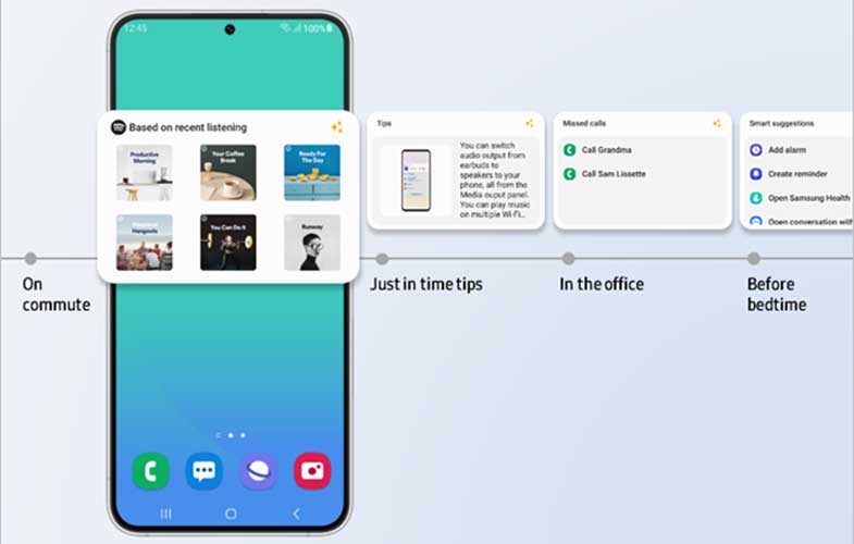 شرکت سامسونگ مدتهاست که برای توسعه قابلیتهای شخصیسازی دستگاههای گلکسی بر روی جنبههای مختلف رابط کاربری و سفارشیسازی ویژگیهای آن تمرکز کرده است. بهروزرسانی One UI 5.1 با چندین ویژگی جدید و هیجانانگیز، به افراد این امکان را میدهد که تقریباً تمام جوانب گوشی همراه خود را، از ظاهر و ارتباطات گرفته تا فعالیتها و موارد دیگر، تنظیم کنند. شرکت سامسونگ در این بهروزرسانی ویژگیهای جدیدی را معرفی میکند که میتواند نحوه استفاده از دستگاه را درک کند و براساس آن توصیهها و پیشنهادهایی به کاربر ارائه کند. برای مثال، ویجت جدید Dynamic weather شرایط آبوهوایی فعلی را تجزیه و تحلیل میکند و بر اساس آن با ایجاد یک طرح سفارشی آن را منعکس میکند. همچنین حالتها و جریانهایی برای فعالکردن والپیپرهای سفارشی، آهنگ زنگ، حساسیت لمس و فونتها گسترش یافتهاند که میتواند فعالیتهای خاص را برای راحتی بیشتر شخصیسازی کند. در این بهروزرسانی همچنین ویجت Smart suggestions بهبود یافته است. اکنون این ویجت آهنگها و لیستپخشهای برنامه Spotify را براساس فعالیتهای کاربران، مانند موسیقی حین سفر یا زمان استراحت، توصیه میکند.