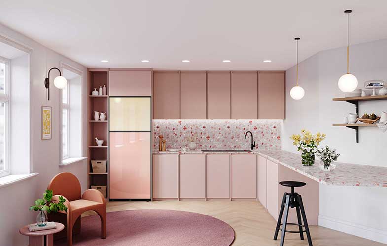 دستگیره درهای یخچال فریزر بالای Bespoke به شکلی طراحی شده که هیچگونه برجستگی بر روی درهای یخخچال و فریز دیده نشود. به همین خاطر این محصول جدید، ظاهری یکپارچه و منسجم دارد که به کمک رنگهای متنوع با هر دکوراسیون و آشپزخانهای هماهنگ میشود.