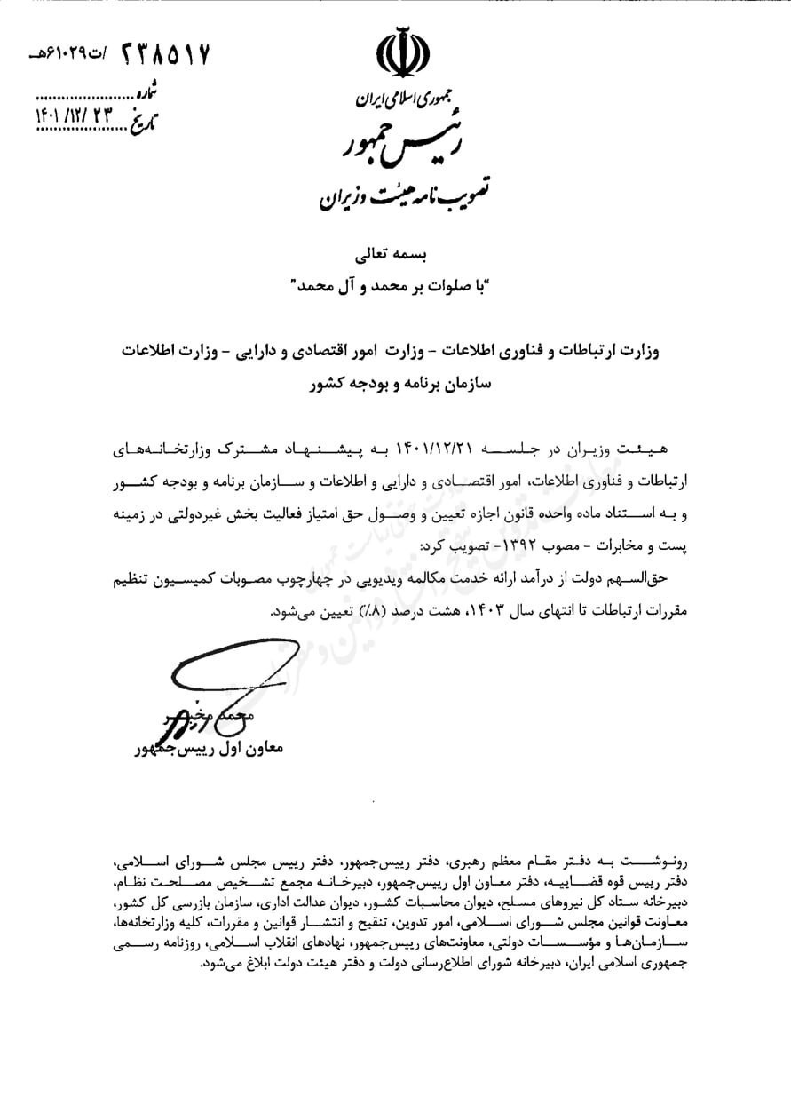 در مصوبه اخیر دولت در این خصوص که به تایید وزارت اطلاعات و به امضای «محمد مخبر»، معاون رئیسجمهور رسیده، آمده است، حقالسهم دولت از درآمد ارائه خدمت مکالمه ویدیویی در چهارچوب مصوبات کمیسیون تنظیم مقررات ارتباطات تا انتهای سال 1403، هشت درصد تعیین میشود.