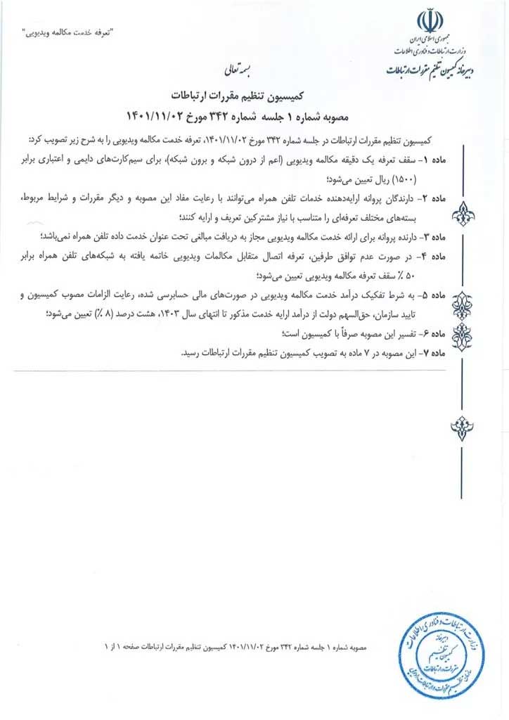 براساس مصوبه کمیسیون تنظیم مقررات، سقف تعرفه یک دقیقه مکالمه ویدئویی (اعم از درونشبکه و برونشبکه) برای سیمکارتهای دائمی و اعتباری برابر 150 تومان است.