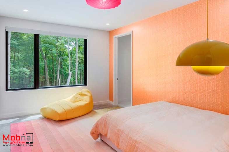از طرفی دیگر طراحی مورب میان اتاق خواب های مهمان و اتاق خواب اصلی حداکثر حریم خصوصی را برای هر دو طرف فراهم می کند. برخلاف نمای بیرونی تیره تر با روکش چوبی، فضای داخلی پر از رنگ های دلنشین است.