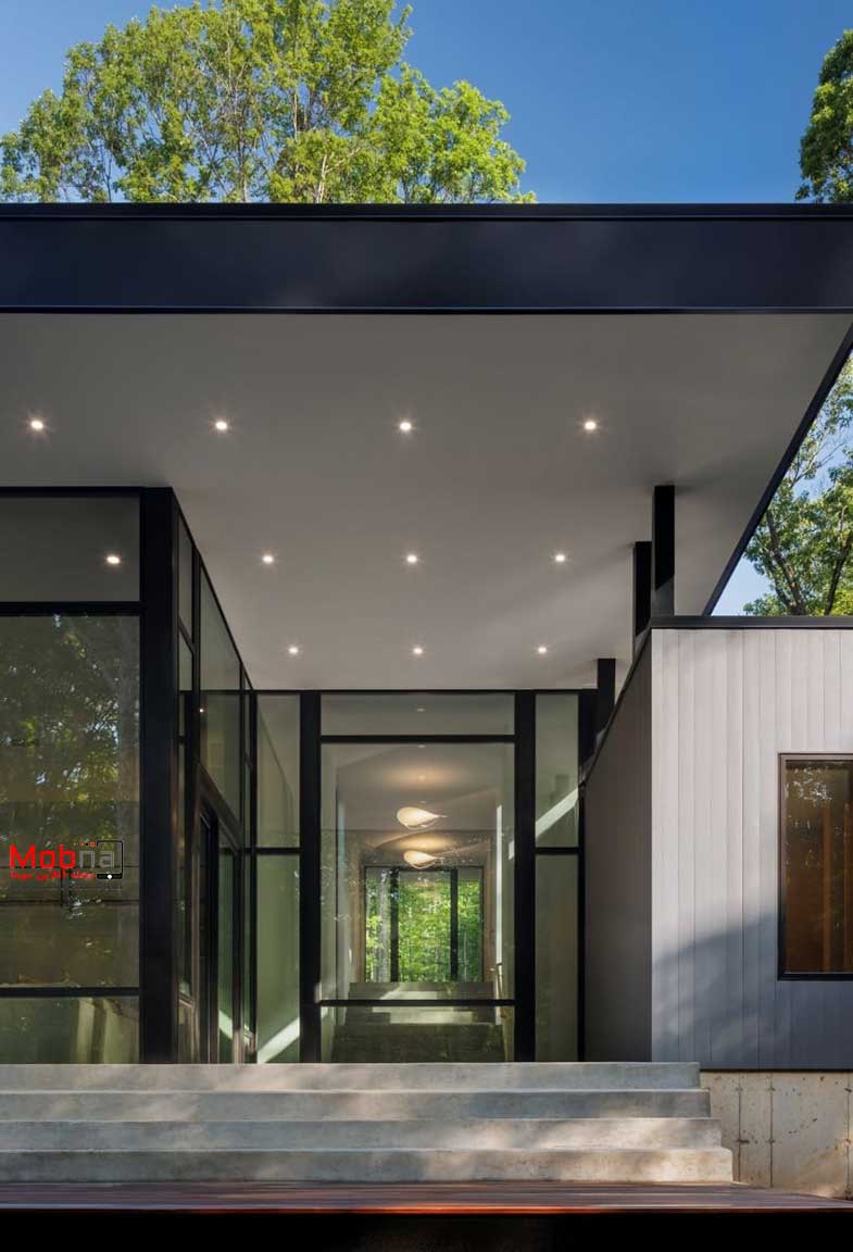 فضای ورودی که به دو حجم جداگانه تقسیم می شود، توسط یک راهرو شیشه ای قابل دسترسی است و سوئیت های مهمان را در خود جای می دهد. حجم پایین تر به نمای پشتی محصور شده با شیشه گشوده می شود و منظره جنگلی وسیعی را از طریق نشیمن اصلی به نمایش می گذارد.