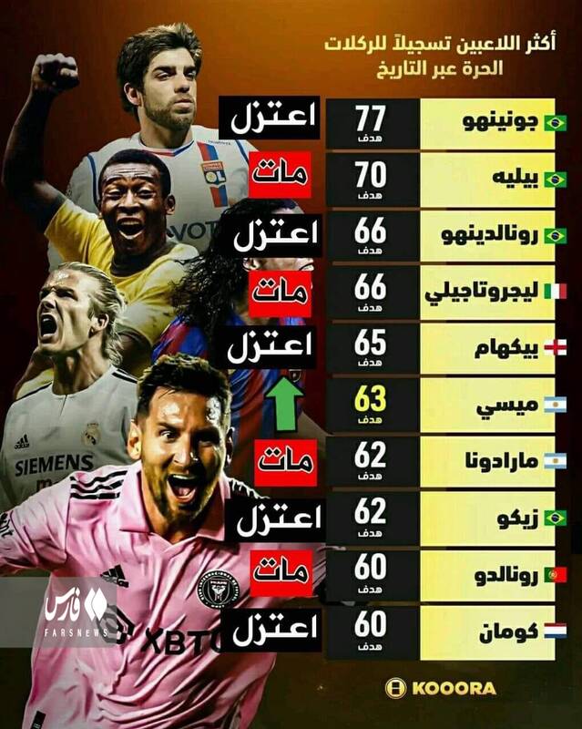 اما با بررسی تاریخ فوتبال جونینیو برزیلی با ۷۷ گل از روی ضربه کاشته بهترین در تاریخ است. پله اسطوره برزیلی با ۷۰ گل در رده دوم و رونالدوینیو برزیلی با ۶۶ گل در رده سوم قرار دارد.