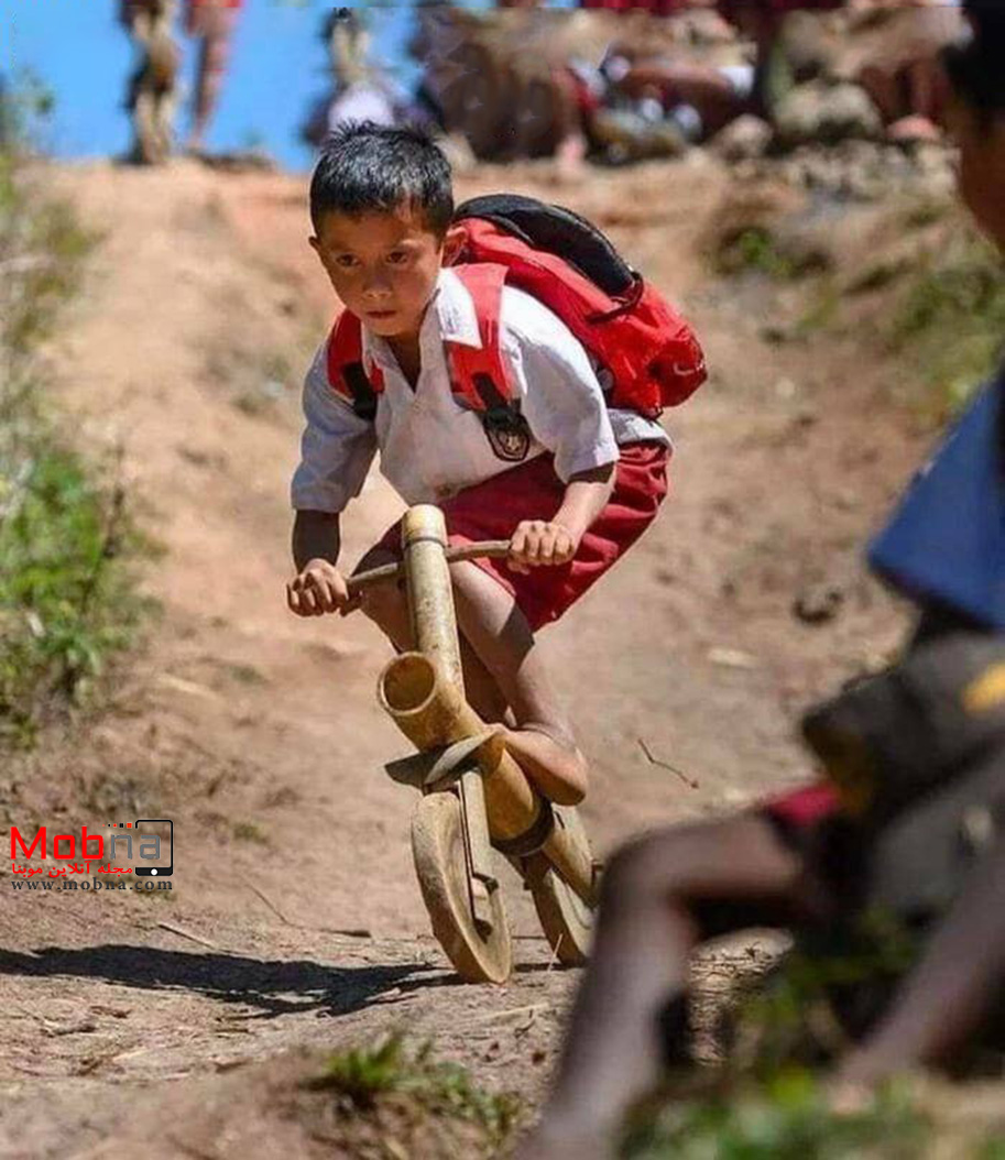 کودک اندونزیایی در حال سواری با دوچرخه دست ساز خودش (عکس)