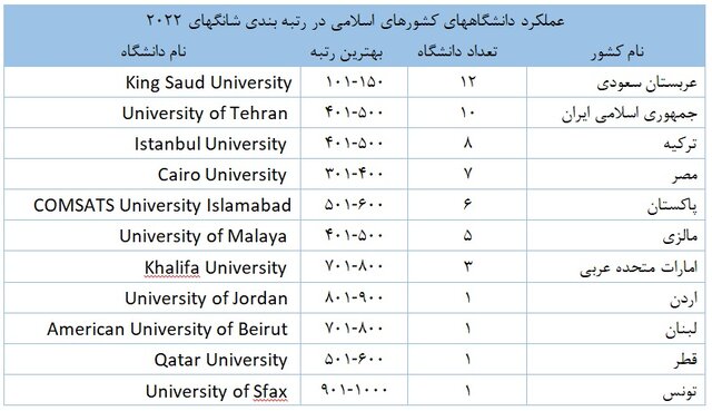 وی ادامه داد: به لحاظ بهترین رتبه، کشور عربستان سعودی با رتبه ۱۵۰-۱۰۱ در رتبه اول، مصر با رتبه ۳۰۱-۴۰۰ در رتبه دوم و جمهوری اسلامی ایران، ترکیه و مالزی با رتبه ۵۰۰-۴۰۱ به صورت مشترک در رتبه سوم قرار گرفتند.