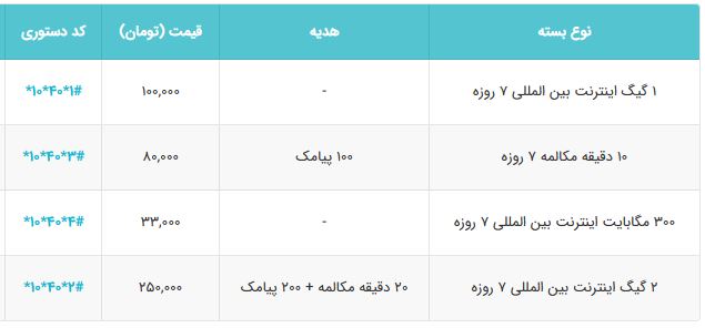 اگر اینترنت کمتری نیاز دارید، میتوانید با کد دستوری ستاره10ستاره40ستاره چهار مربع و پرداخت 33 هزار تومان، معادل 300 مگابایت اینترنت بینالمللی هفت روزه دریافت کنید.