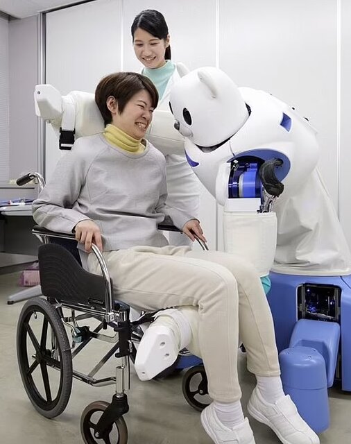 «روبیر»(Robear) یک ربات به شکل خرس عروسکی است که بیماران معلول یا مسن را از روی تخت بلند میکند و روی ویلچر مینشاند. بدنه نرم و بالشتکی ربات به گونهای طراحی شده است که روی پوست بیمار به صورت ملایم حرکت کند و در عین حال، حداکثر حمایت را داشته باشد.
