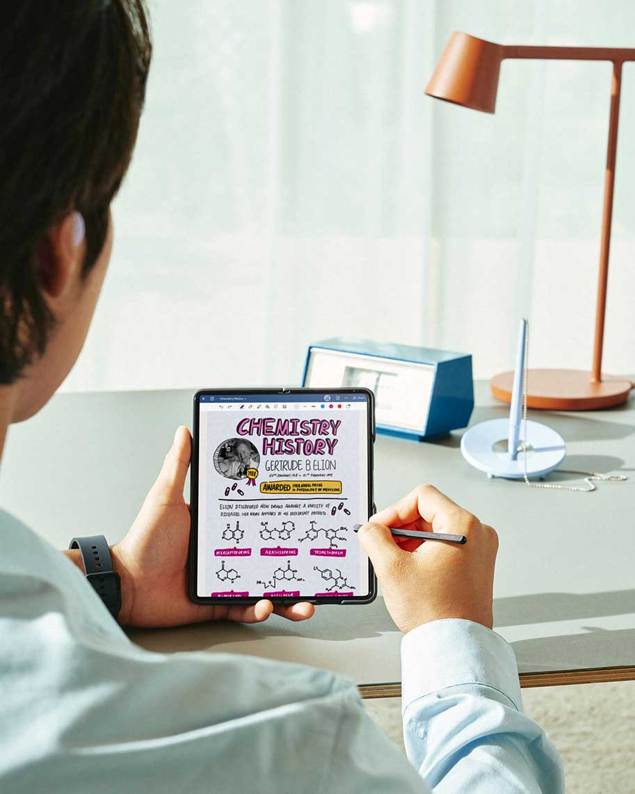 صفحه‌نمایش 7.6 اینچی Dynamic AMOLED 2X این گوشی، محتواهای متنی و ویدئویی را در نهایت کیفیت و جزئیات به شما ارائه می‌دهد. گلکسی Z Fold5 با قابلیت‌هایی نظیر Multi Tasking و Multi Window شما را وارد مرحله جدیدی از عملکرد مولتی‌تسکینگ می‌کند. تصور کنید در کنار تماشای یک ویدیوی آموزشی یا کلاس درسی آنلاین، به راحتی بتوانید با اپلیکیشن Note نکات مهم ویدیو را یاداشت کنید یا به حل تمرین‌های آن به‌صورت همزمان بپردازید و دیگر برای رسیدگی به تکالیف خود میان دستگاه‌ها و مقالات متعدد سردرگم نشوید.