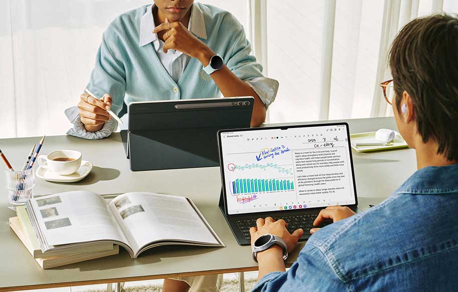 تبلت‌های سری گلکسی Tab از سامسونگ نیز از آن دسته محصولاتی است که همچون ابزاری کارآمد تجربه درسی شما را به شکلی موثر ارتقا می­دهد. جدیدترین نسخه این تبلت‌ها با نام گلکسی Tab S9 در نسخه Ultra دارای صفحه نمایشی بزرگ به اندازه 14.6 اینچ است و با نرخ تازه‌سازی تصویر که به طور خودکار از 60 تا 120 هرتز کالیبره می‌شود، نمایش روان محتوا تضمین می‌شود. همچنین ویژگی Eye Comfort با کاهش نور آبی تصاویر، خستگی چشم را تا بیش از 70 درصد کاهش می‌دهد.