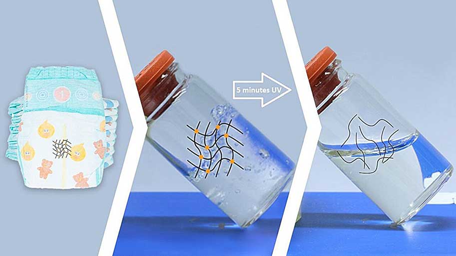 سدیم پلی آکریلات محلول حاصل شده از بازیافت پوشک ها را می توان به عنوان نمونه برای ساخت رنگ یا تولید چسب حساس به فشار استفاده کرد. به احتمال زیاد، می توان آن را به بسیاری از محصولات دیگر نیز تبدیل کرد.