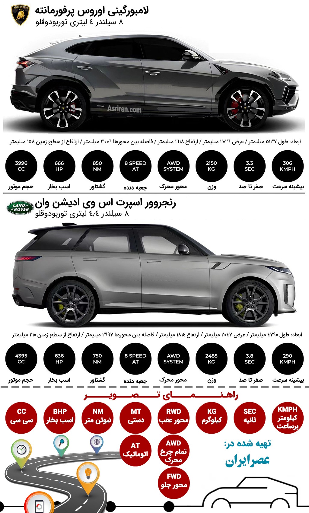 در مجموعه مطالب خودروگرافی، هر بار دو محصول کنار یکدیگر قرار می گیرند و جذاب ترین اطلاعات مرتبط با آن ها در تصویر نمایش داده می شود. این بار سراغ دو شاسی بلند خاص از لامبورگینی و رنجروور می رویم/ سلیقه و اطلاعات خود را در بخش نظرات با ما به اشتراک بگذارید…
