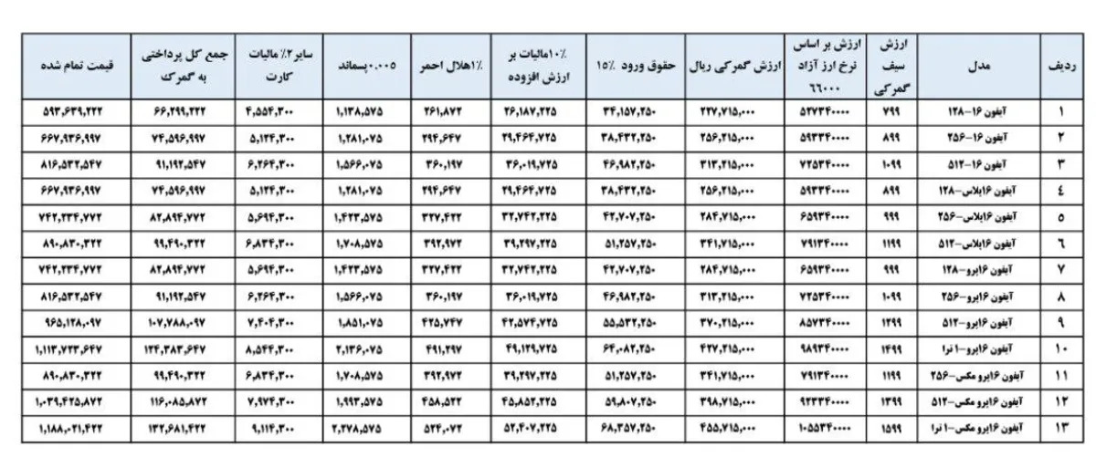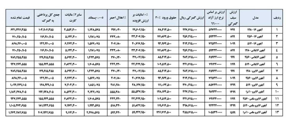 سازمان گمرک ایران قیمت نهایی گوشیهای سری آیفون ۱۶ را برای واردات تجاری و مسافری اعلام کرد.