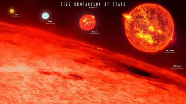 جهان هستی مملو از ستاره های گوناگون است. برخی از آنها بسیار کوچکتر از خورشید هستند و برخی دیگر میتوانند خورشید را چه از نظر درخشندگی و چه از نظر ابعاد محو کنند. قطر خورشید ۱.۴ میلیون کیلومتر است که یعنی میتواند ۱.۳ میلیون کره زمین را در خود جا دهد. هرچند در ستارهشناسی کیلومتر نمیتواند مقیاس مناسبی برای نشان دادن ابعاد ستاره های بزرگ باشد. به همینخاطر ابعاد آنها را با شعاع خورشیدی (معادل شعاع خورشید) نشان میدهند.