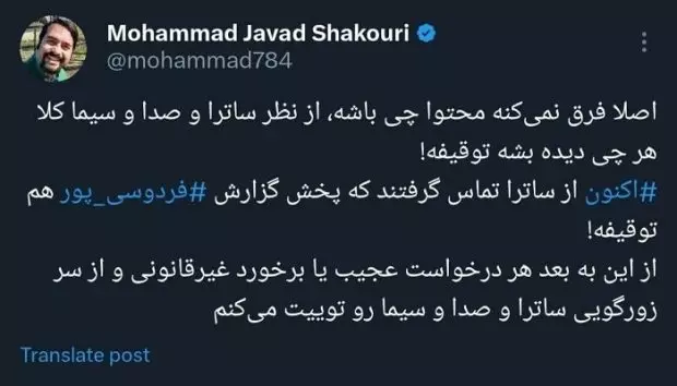 اصلا فرق نمیکند که محتوا چه چیزی باشد. از نظر ساترا و صدا و سیما هر چیزی دیده شود، توقیف است! اکنون از ساترا تماس گرفتند که پخش گزارش فردوسی پور هم توقیف است.