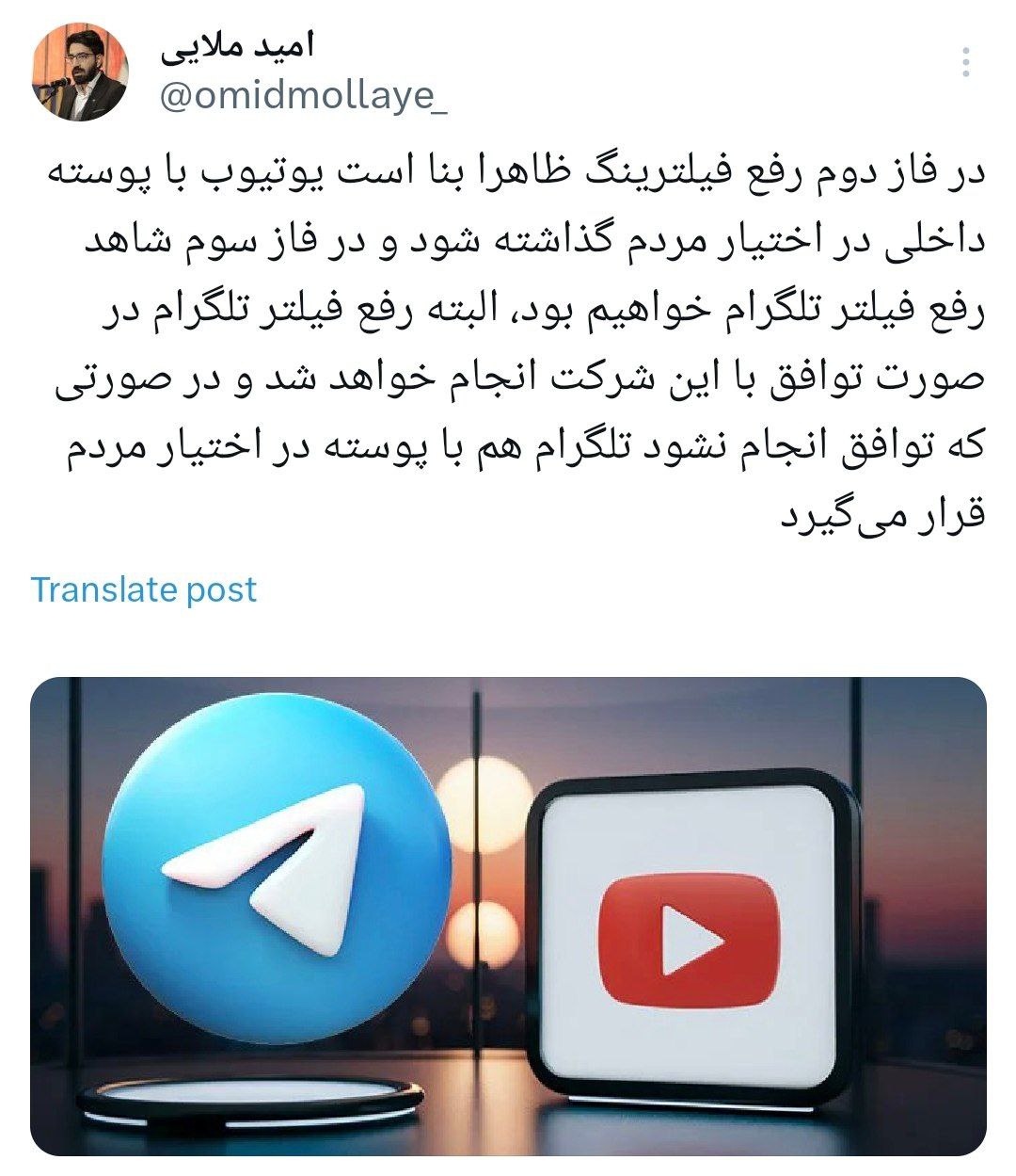 امید ملایی نوشت: امروز اولین مرحله از رفع فیلترینگ انجام شد و در دو مرحله بعدی قرار است با شرطهایی رفع فیلترینگ یوتیوب و تلگرام انجام شود