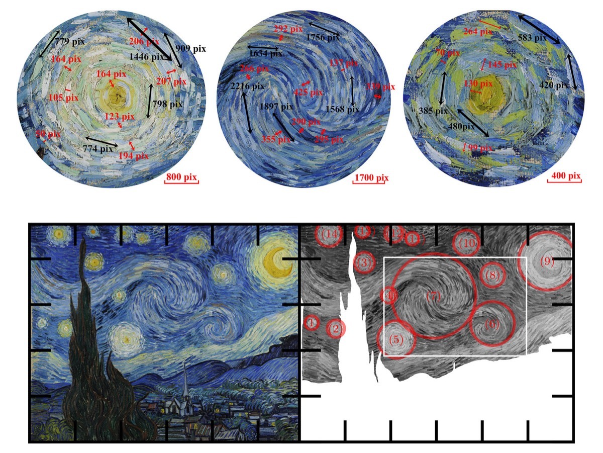آنها شواهدی از چیزی بسیار نزدیک به مقیاس بندی کولموگروف، نه فقط در شب پر ستاره، بلکه در دو نقاشی دیگر از همان دوره زندگی ونگوگ یافتند: گندم زار با کلاغها و جادهای با سرو و ستاره. هوانگ یک دانشمند دریایی است که با فیزیکدانان همکاری کرد تا الگوهای متلاطم نهفته در شاهکار ونگوگ را از نزدیک ببیند. آنها بر روی مطالعه مقیاسهای فضایی ۱۴ گرداب چرخشی اولیه در نقاشی تمرکز کردند و از روشنایی نسبی رنگ به عنوان آنالوگ برای انرژی جنبشی استفاده کردند. به طور خاص، آنها دقیقاً اندازه ضربههای قلموی معمولی را اندازهگیری کردند و سپس آن مقیاسها را با آنچه توسط دینامیک سیالات پیشبینی میشود مقایسه کردند.
