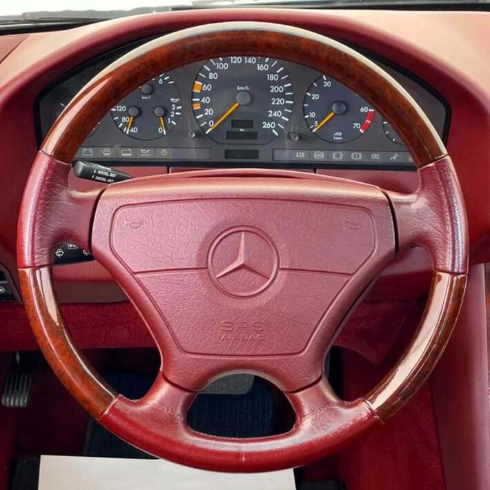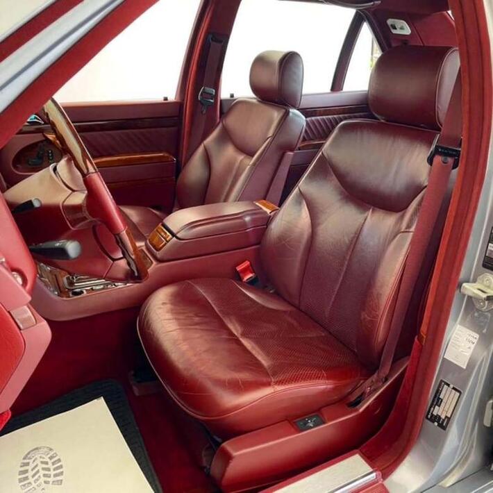 مرسدس بنز ۶۰۰SEL AMG مدل ۱۹۹۲ با چرم قرمز عنابی، تریم چوب بسیار زیبا