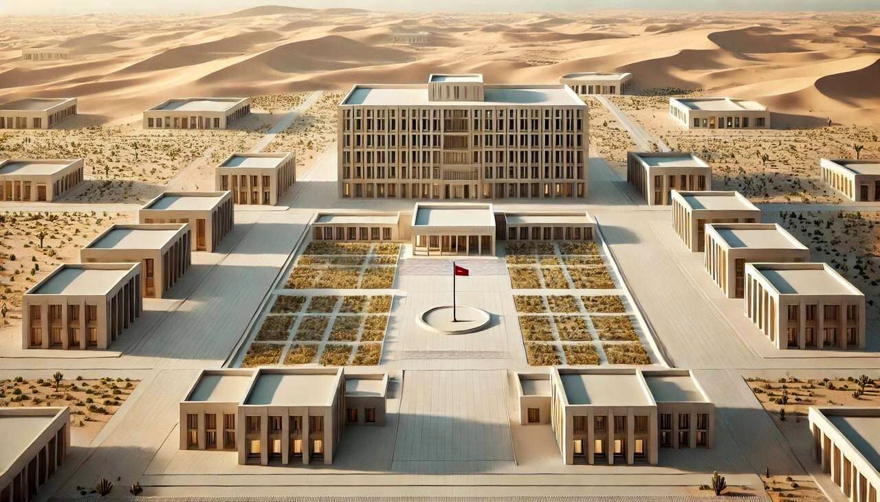 همچنین یک مجموعه بزرگ حکومتی با تلفیق معماری سنتی جنوب ایران و سبکهای مدرن در کنار باغهای سبز و نخلهای بلند و مجموعهای که شاید حیاط دولت باشد! حیاط مرکزی ریاست جمهوری با طراحی کاربردی و هماهنگی با محیط بومی .