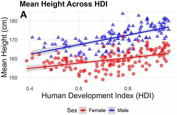 این مطالعه تایید می‌کند که بین شاخص توسعه انسانی (HDI) و افزایش قد و وزن رابطه مستقیمی وجود دارد. کشورهایی که از نظر اقتصادی و سلامتی در سطح بالاتری قرار دارند، مردان و زنان بلندقدتر و سنگین‌تری دارند؛ اما این تغییرات در مردان بسیار بیشتر است. به عنوان مثال در کشورهای با HDI بالا، دامنه وزن مردان گسترده‌تر است؛ در حالی که تغییرات قد مردان با افزایش HDI کاهش می‌یابد.