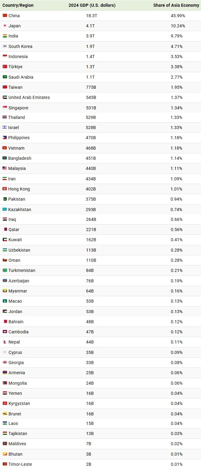 بعد از چین، ژاپن و هند، کشورهای کره جنوبی و اندونزی به ترتیب با ۱.۹ و ۱.۴ تریلیون دلار در رتبههای بعدیاند. این ۵ کشور ۷۴ درصد اقتصاد آسیا را دارند.