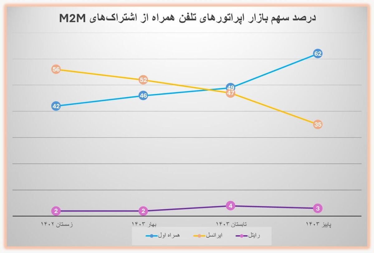 سهم بازار اشتراکهای M۲M همراه اول ۶۲ درصد، ایرانسل ۳۵ درصد و رایتل ۳ درصد تا پایان پاییز ۱۴۰۳ بوده که فقط اپراتور اول تلفن همراه افزایش مثبت داشته است.
