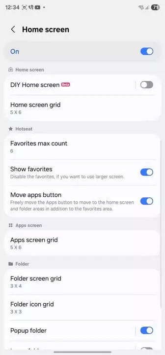 شما میتوانید داک گوشی گلکسی خود را بهطور کامل پنهان کنید یا اینکه تا ۹ میانبر را در آن جا دهید. همچنین میتوانید از ماژول Home Up برای شخصیسازی تعداد ستونها و ردیفهای منو اصلی، صفحه پوشه و آیکون پوشه بهره ببرید.